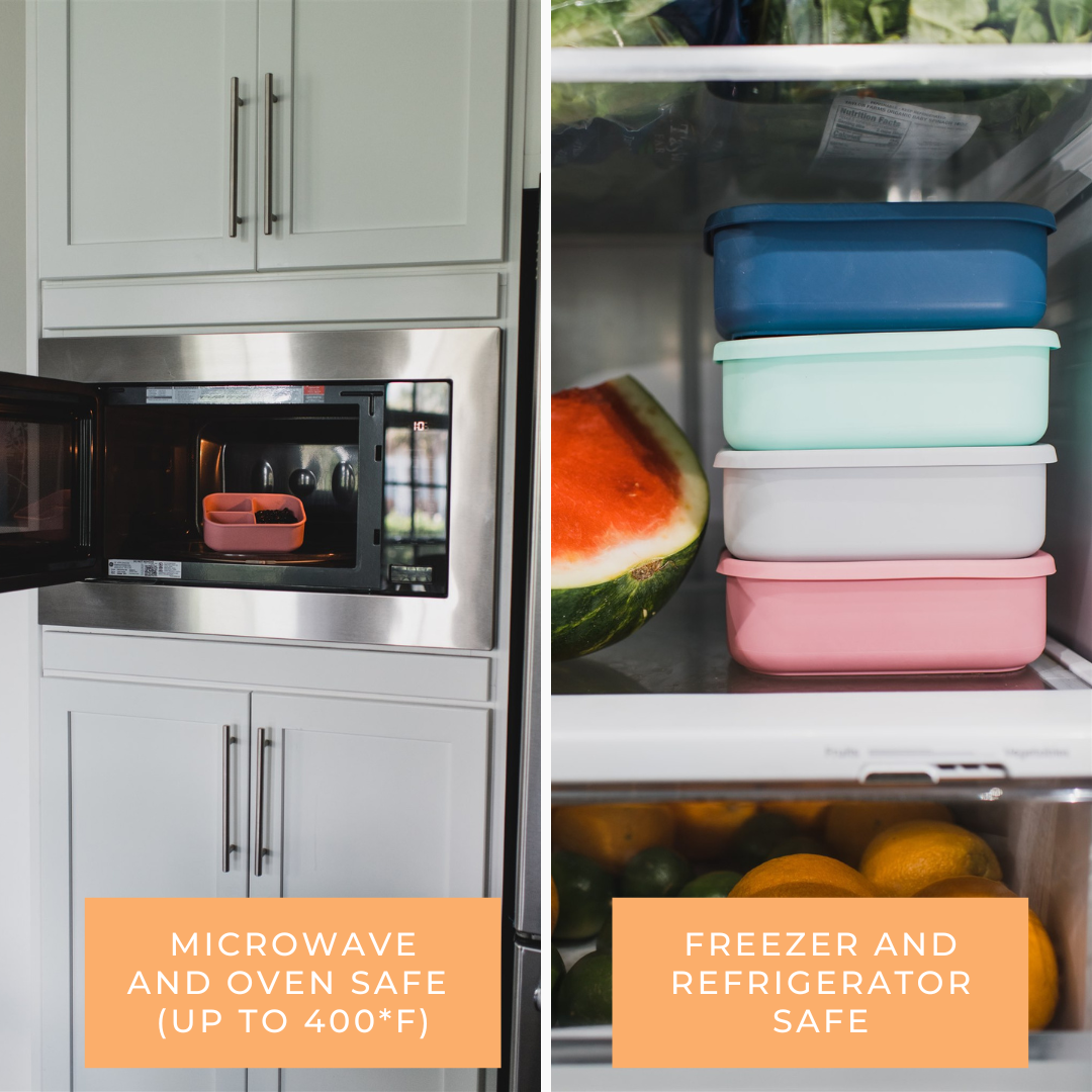 Yes! Our Containers are made from silicone that can handle both low and high temperatures, making it perfect for reheating food. It transitions easily from the fridge or freezer to the oven, microwave, or air fryer. It's also oven-safe up to 400°F, so you can also bake in them!