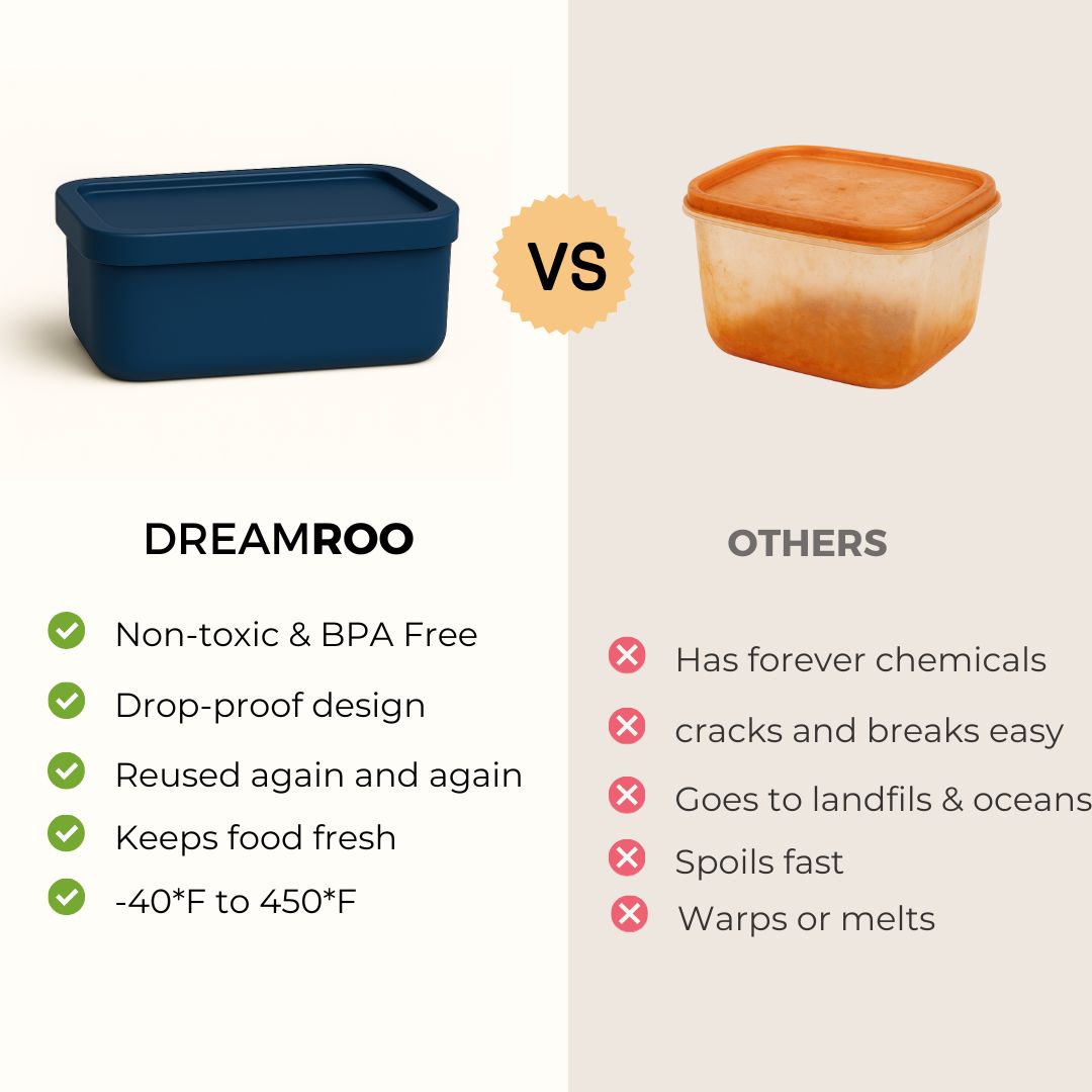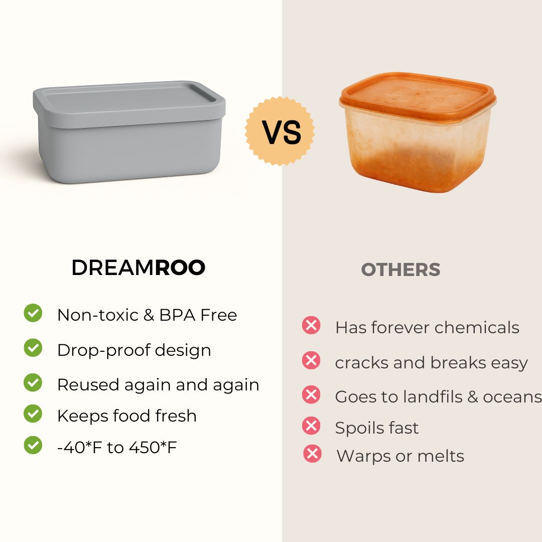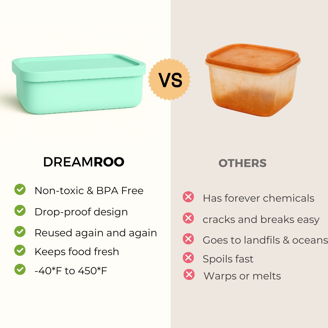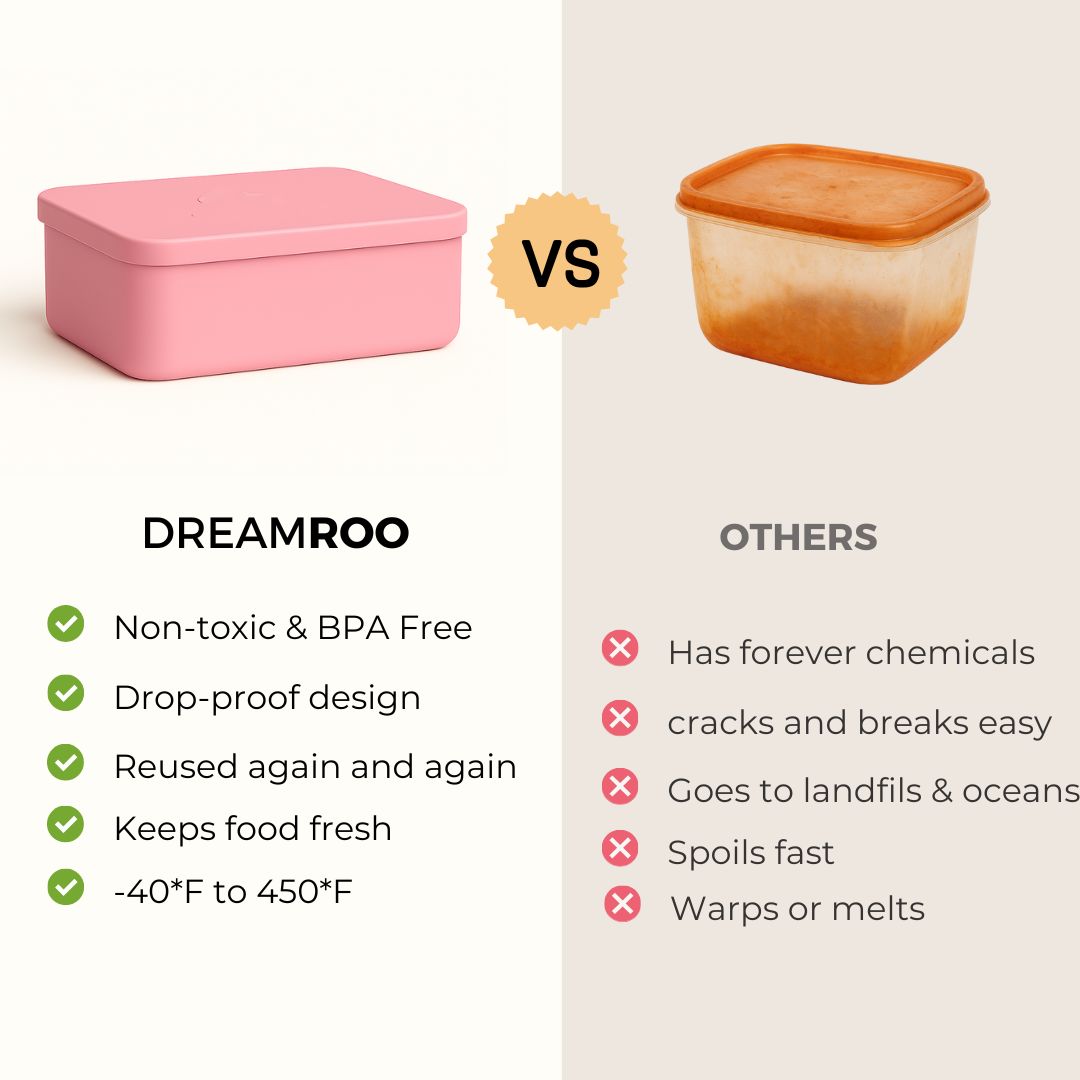 Dreamroo Container are made from 100% non-toxic, food-grade silicone, free from BPA, PVC, and phthalates, ensuring it's safe for your family and the environment.