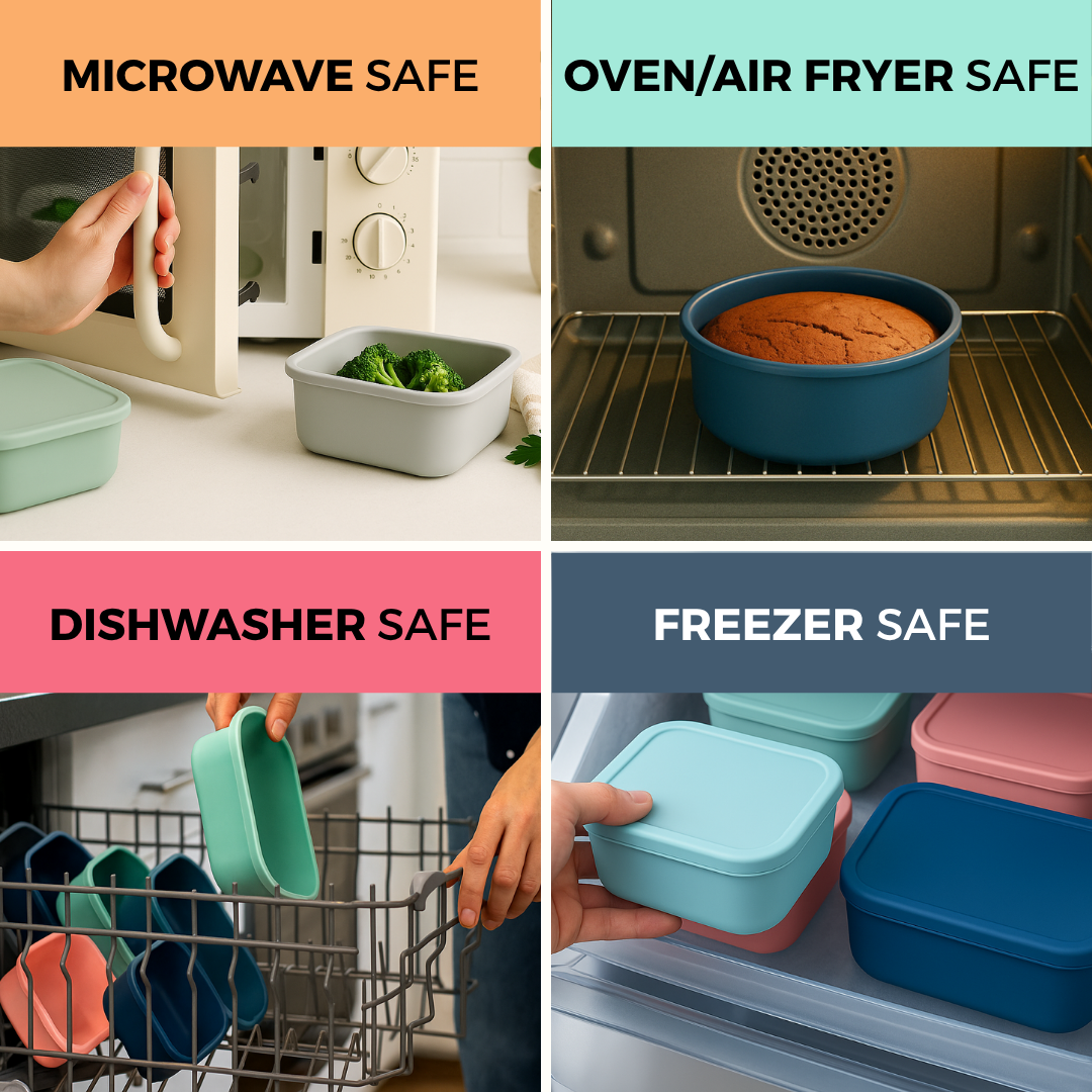 Yes! Our Containers are made from silicone that can handle both low and high temperatures, making it perfect for reheating food. It transitions easily from the fridge or freezer to the oven, microwave, or air fryer. It's also oven-safe up to 400°F, so you can also bake in them!